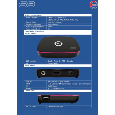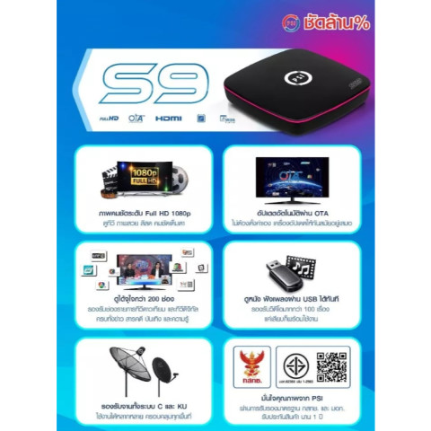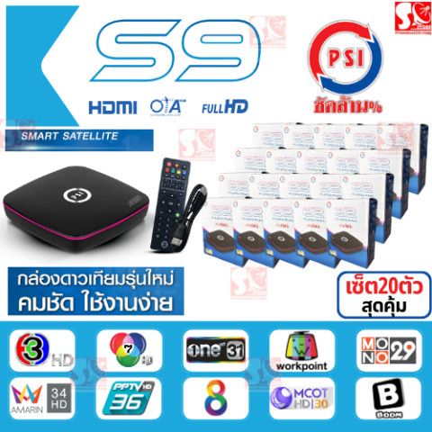 PSI S9 แพ็ค 20 เครื่อง (รุ่นใหม่ คมชัดกว่าเดิม) กล่องรับสัญญาณดาวเทียมที่ออกแบบมาเพื่อภาพคมชัดระดับ Full HD 1080p สีสันสดใส ใช้งานได้กับจานดาวเทียมทั้ง C-Band และ KU-Band อัปเดตช่องรายการให้อัตโนมัติผ่านดาวเทียม (OTA) ไม่ต้องตั้งค่าเอง เหมาะสำหรับงานติดตั้ง/จำหน่ายแบบยกแพ็ค รับชมความบันเทิงได้มากกว่า 200 ช่อง พร้อมรองรับการเล่นไฟล์หนังและเพลงผ่าน USB 2.0