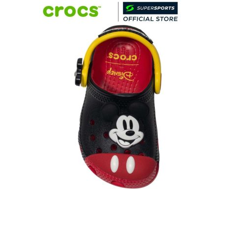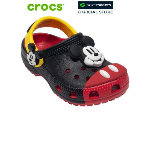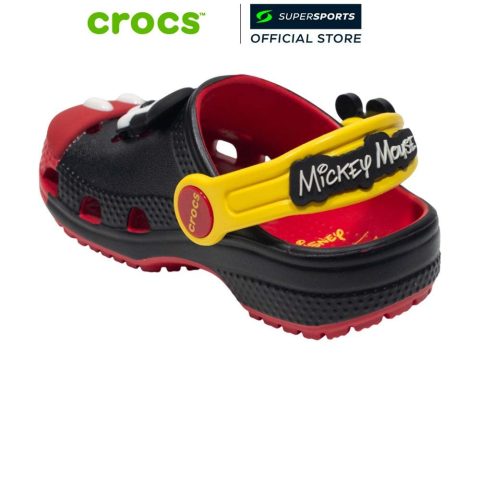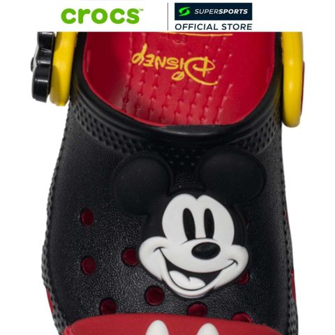 CROCS Mickey Mouse Classic Clog รองเท้าลำลองเด็ก เติมความสนุกให้ทุกก้าวด้วยดีไซน์สุดไอคอนิกจากมิกกี้เมาส์—อัปเปอร์สีดำ ปลายเท้าสีแดง และกระดุมสีขาวที่ได้แรงบันดาลใจจากชุดเอกลักษณ์ของ Mickey Mouse พร้อมรายละเอียดใบหน้าแบบสามมิติและรอยยิ้มที่ช่วยให้ลุคดูมีชีวิตชีวา เหมาะสำหรับใส่เที่ยว เล่น หรือใส่ลำลองในทุกวัน