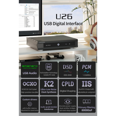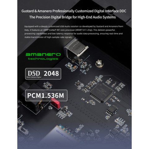 ด้วยความร่วมมือระหว่าง Gustard และ Amanero (อิตาลี) พร้อมแกนประมวลผล ARM® Cortex®-M7 (IMXRT1011) ทำให้ U26 รองรับไฟล์ความละเอียดสูงแบบจัดเต็มตั้งแต่ PCM สูงสุด 32-bit/1536kHz ไปจนถึง Native DSD2048 ส่งต่อสัญญาณดิจิทัลไปยังอุปกรณ์ปลายทางได้อย่างมั่นใจผ่านเอาต์พุตที่หลากหลาย