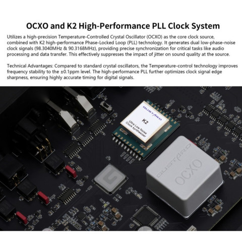 หัวใจของความเหนือชั้นอยู่ที่ระบบนาฬิกา OCXO ควบคุมอุณหภูมิ ที่มีเสถียรภาพความถี่ระดับ ±0.1 ppm ทำงานร่วมกับเทคโนโลยี K2 PLL เพื่อลด Phase Noise และลด Jitter ให้สัญญาณ “ตรงเวลา” มากขึ้น ส่งผลให้โฟกัสชัดขึ้น เสียงร้องนิ่งขึ้น และมวลเสียงมีรูปทรงที่แม่นยำ