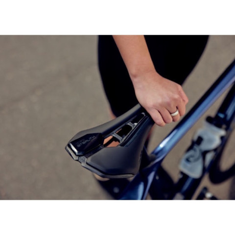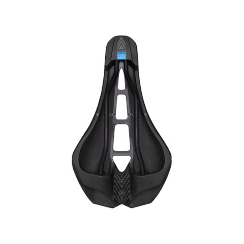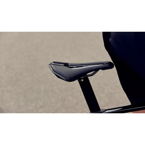 ดีไซน์เบาะทรงสั้นพร้อม “จมูกเบาะกว้าง” ช่วยให้คุมท่าทางได้มั่นคง โดยเฉพาะการปั่นท่าก้ม/แอโร่ เสริมด้วยฐานเบาะวัสดุคาร์บอนผสมโพลีเมอร์ และช่องกลางแบบ Triple Bridge ที่ให้ความสติฟและความเสถียรสูง ช่วยถ่ายแรงลงบันไดได้คมและไวกว่าเดิม