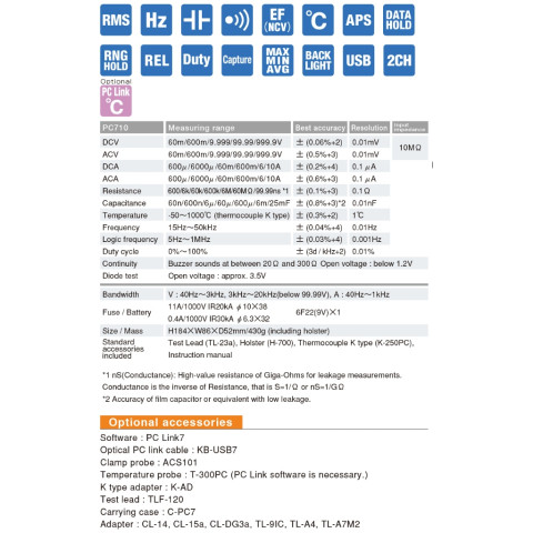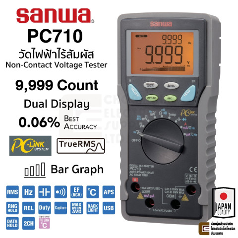 Sanwa PC710 ดิจิตอลมัลติมิเตอร์ True RMS (PC-Link) วัดไฟฟ้าไร้สัมผัส NCV มัลติมิเตอร์เกรดมืออาชีพที่โดดเด่นด้วยความแม่นยำสูงสุด 0.06% และความละเอียดการแสดงผล 9,999 Count เหมาะทั้งงานซ่อมบำรุง งานอุตสาหกรรม งานอิเล็กทรอนิกส์ และงานวัดที่ต้องการความเชื่อถือได้ พร้อมฟังก์ชัน Dual Display ดูค่าได้มากกว่า 1 อย่างในหน้าจอเดียว และรองรับการเชื่อมต่อคอมพิวเตอร์ผ่านระบบ PC-Link (อุปกรณ์/ซอฟต์แวร์บางรายการเป็นออปชัน)