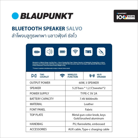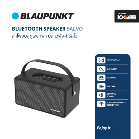 BLAUPUNKT ลำโพงบลูทูธพกพา รุ่น SALVO พลังเสียงแน่น เบสหนักสะใจ กำลังขับรวม 60 วัตต์ พร้อมลำโพง 3 ตัว ให้มิติเสียงเต็มอิ่ม เหมาะทั้งฟังเพลงในบ้าน ปาร์ตี้เล็กๆ หรือพกไปใช้นอกสถานที่ ด้วยดีไซน์พรีเมียมวัสดุ Leather ผสานแผงหน้าผ้า Fabric ให้ลุคคลาสสิกและทนทาน พร้อม ไมโครโฟน HD ในตัว ใช้คุยสายหรือประชุมออนไลน์ได้สะดวก