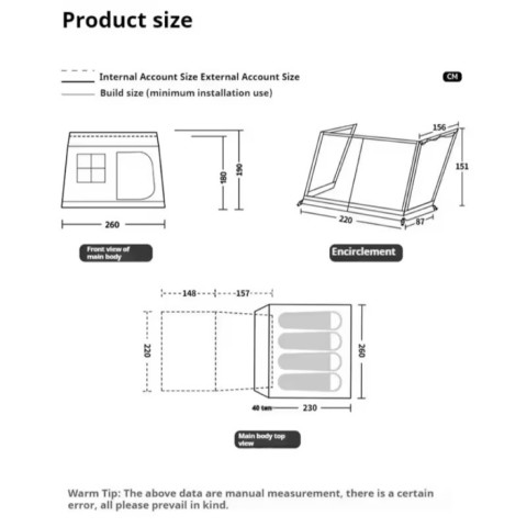 ขนาดห้องนอน (Inner Tent): 260 x 230 x 180 ซม.