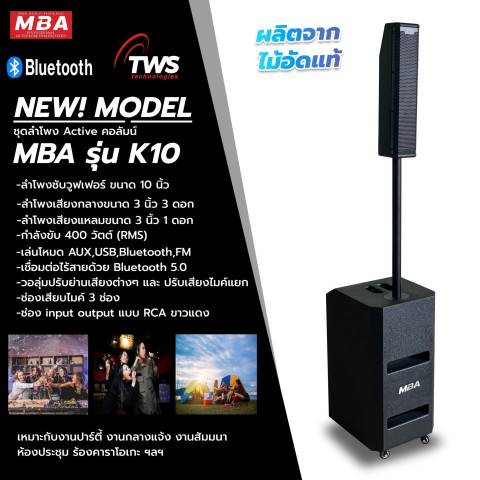 WEMICGLOBALSOUND ตู้ลำโพงคอลัมน์แบบแอคทีฟ รุ่น K-10 พลังเสียงเต็มอิ่มกำลังขับ 400W (RMS) มาพร้อมซับเบส 10 นิ้ว และชุดคอลัมน์ที่ให้มิติเสียงกระจายกว้าง เหมาะทั้งงานร้องเพลง งานอีเวนต์ ร้านค้า ห้องซ้อม หรือใช้งานกลางแจ้งแบบคล่องตัว ด้วยแอมป์ในตัวและการเชื่อมต่อ Bluetooth 5.0 ใช้งานง่าย ไม่ยุ่งยาก