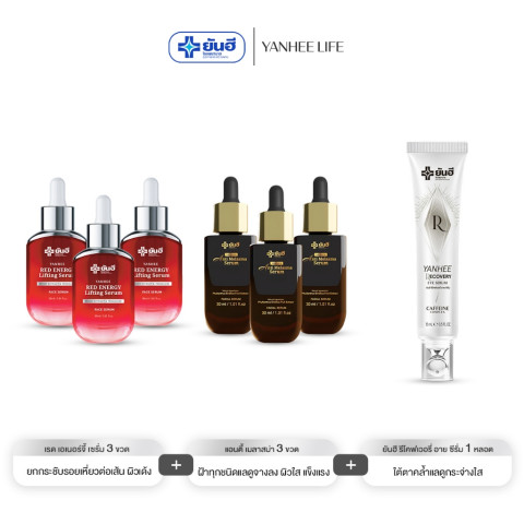 Yanhee Serum เซตลดริ้วรอย | แดง3 + ดำ3 + อายซีรั่ม1 เซตดูแลผิวหน้าครบจบจากยันฮี เพื่อจัดการปัญหาหลักของวัย 30+ ทั้งริ้วรอย ตีนกา ร่องแก้ม ความหมองคล้ำ และฝ้า/กระ/จุดด่างดำ ช่วยให้ผิวดูเรียบเนียน กระชับ อิ่มฟู สีผิวสม่ำเสมอขึ้น พร้อมบำรุงผิวรอบดวงตาให้ดูสดใสอย่างเป็นธรรมชาติ