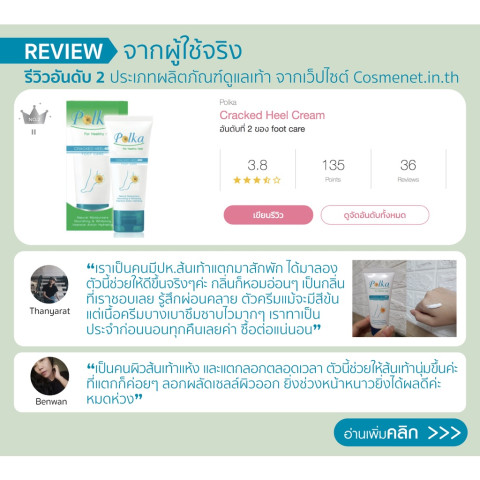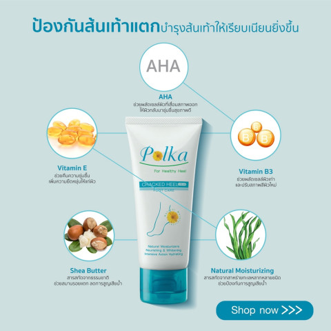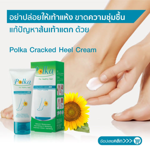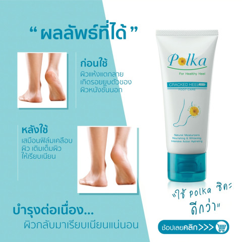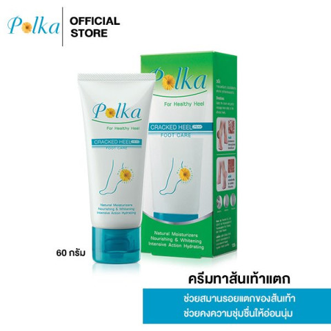 Polka Cracked Heel Cream 60 g. ครีมทาส้นเท้าแตกสูตรเข้มข้น ช่วยดูแลปัญหาผิวแห้งกร้านและส้นเท้าแตกอย่างตรงจุด ด้วยคุณสมบัติช่วยป้องกันการสูญเสียน้ำและกักเก็บความชุ่มชื้นไว้ใต้ผิวได้ยาวนาน ทำให้ผิวนุ่มขึ้น ไม่แห้งตึง พร้อมช่วยผลัดเซลล์ผิวเก่าและปรับสภาพสีผิวให้แลดูกระจ่างใส เรียบเนียนขึ้น เหมาะสำหรับผู้ที่มีปัญหาส้นเท้าแตกเป็นร่องหรือผิวบริเวณเท้าหยาบกร้านจากการยืน/เดินนานๆ