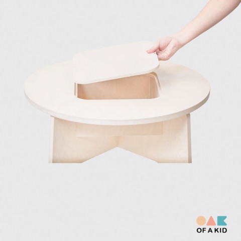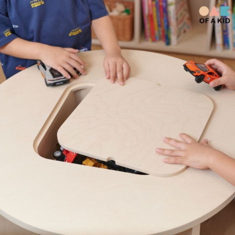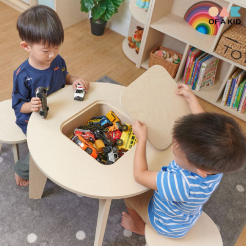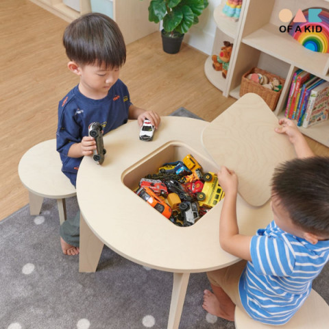 OF A KID โต๊ะกลม Round Table ราคา 5,990.00 บาท คือโต๊ะกิจกรรมสำหรับเด็กที่ออกแบบมาอย่างเข้าใจพฤติกรรมการเรียนรู้และการเล่นของวัยเด็ก ด้วยรูปทรงกลมช่วยให้เด็กนั่งล้อมวงทำกิจกรรมร่วมกันได้อย่างเป็นธรรมชาติ พร้อม ช่องเก็บของตรงกลาง ช่วยจัดระเบียบอุปกรณ์วาดเขียน หนังสือ หรือของเล่นให้หยิบใช้ง่ายและเป็นระเบียบ เหมาะสำหรับสร้างมุมเรียนรู้ มุมศิลปะ และมุมอ่านหนังสือภายในบ้านได้อย่างลงตัว