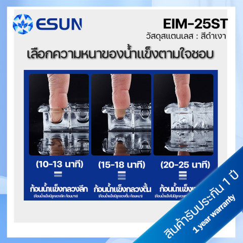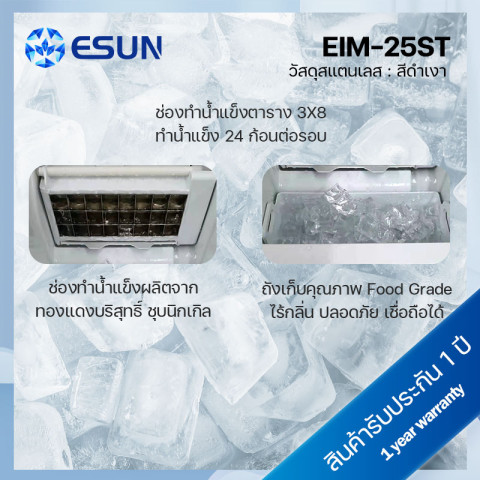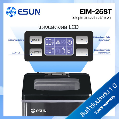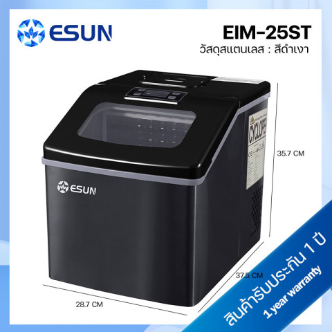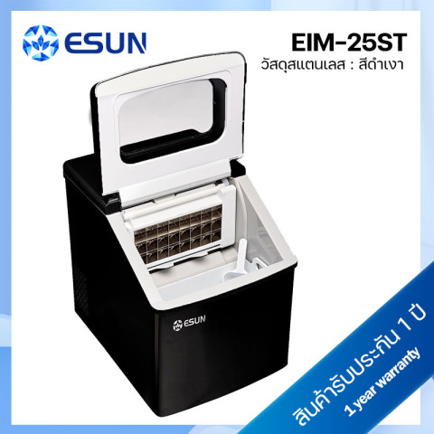 ESUN เครื่องทำน้ำแข็ง Ice Maker รุ่น EIM-25ST สีดำ (สแตนเลส) ผู้ช่วยคู่ใจสำหรับบ้าน ร้านค้า หรือออฟฟิศ ผลิตน้ำแข็งได้รวดเร็วทันใจ เพียงเติมน้ำแล้วกดปุ่มก็พร้อมใช้งาน มาพร้อมดีไซน์สแตนเลสดำดูหรู แข็งแรงทนทาน และระบบแจ้งเตือนครบ ทั้งน้ำหมด/ถาดน้ำแข็งเต็ม ใช้งานง่ายด้วยไฟแสดงผลแบบ LED