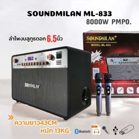 (พร้อมส่ง) ลำโพงบลูทูธ Soundmilan ML-833 (จัมโบ้) ลำโพงคาราโอเกะแบบพกพาที่ให้พลังเสียงกระหึ่ม เบสแน่น ฟังเพลงสนุก ร้องคาราโอเกะมันส์ยิ่งขึ้น พร้อมความคุ้มค่าแบบจัดเต็ม แถมฟรีไมค์ลอย 2 ตัว เหมาะทั้งงานสังสรรค์ในบ้าน ปาร์ตี้นอกสถานที่ ร้านค้า หรือกิจกรรมกลางแจ้ง