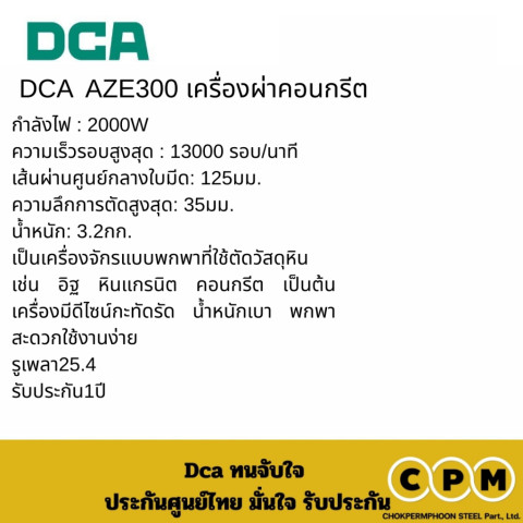 DCA AZE300 เครื่องผ่าคอนกรีต พลังแรงตัดคม สำหรับงานก่อสร้างและงานปรับปรุงที่ต้องการความรวดเร็วและแม่นยำ ใช้งานได้กับวัสดุแข็งหลากชนิด เช่น อิฐ หินแกรนิต และคอนกรีต ด้วยดีไซน์กะทัดรัด น้ำหนักเบา จับถนัดมือ พกพาง่าย เหมาะทั้งช่างมืออาชีพและงานไซต์ทั่วไป
