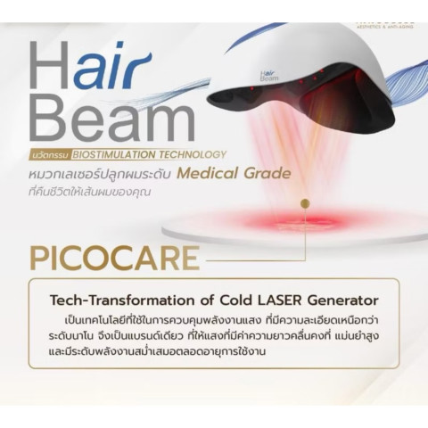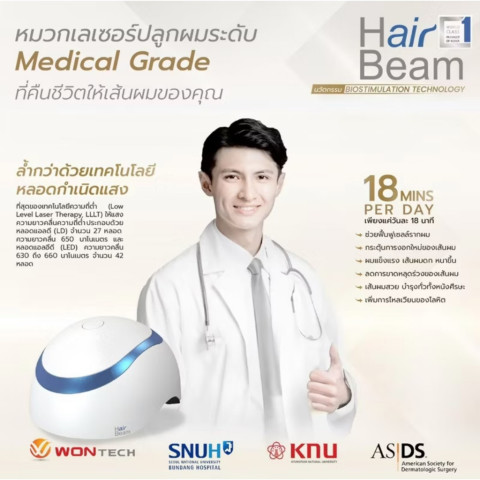 Hair Beam Air หมวดเลเซอร์ปลูกผมเกาหลีระดับเวิลด์คลาส สำหรับดูแลปัญหาผมร่วงและศีรษะบางได้ด้วยตัวเองที่บ้าน เพียงวันละ 18 นาที ด้วยเทคโนโลยีเลเซอร์เพื่อการบำบัดเส้นผม (Home Therapy) ช่วยกระตุ้นรากผมให้กลับมาแข็งแรง เหมาะทั้งผู้ที่มีปัญหาผมร่วงทั่วไป ไปจนถึงผู้ที่ต้องการดูแล หลังปลูกผม เพื่อสนับสนุนการฟื้นตัวและเพิ่มความหนาแน่นของเส้นผม