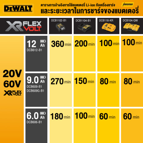 ใช้งานร่วมกับเครื่องมือไร้สาย DEWALT ระบบ 60/54V หรือ 20/18V ได้หลากหลายรุ่น