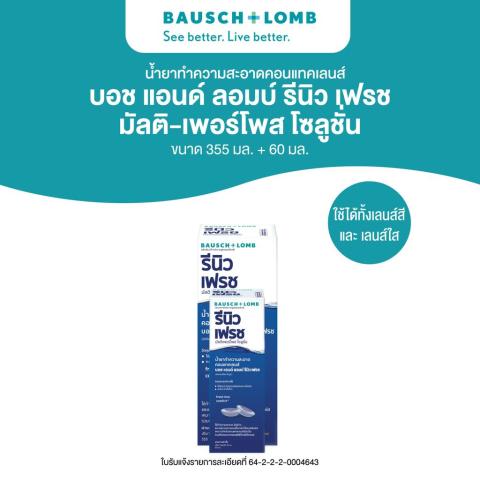 Bausch & Lomb RENU Fresh น้ำยาทำความสะอาดคอนแทคเลนส์แบบมัลติ-เพอร์โพสโซลูชั่น ดูแลครบจบในขวดเดียว ช่วยทำความสะอาด ชะล้างคราบโปรตีนและสิ่งสกปรก พร้อมให้ความชุ่มชื้น เพื่อความสบายตาตลอดวัน เหมาะสำหรับผู้ใช้คอนแทคเลนส์นิ่มที่ต้องการความสะอาดมั่นใจในทุกครั้งที่สวมใส่