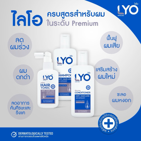ช่วยลดการหลุดร่วงของเส้นผม กระตุ้นการงอกใหม่ของเส้นผมให้แข็งแรง ลดความมันและความสกปรกบนหนังศีรษะ ลดอาการคันและขจัดรังแค พร้อมช่วยชะลอผมหงอกก่อนวัย ทำให้เส้นผมดกดำอย่างเป็นธรรมชาติ ใช้ได้ทุกวันโดยไม่ทำให้หนังศีรษะแห้งLYO Shampoo แชมพู