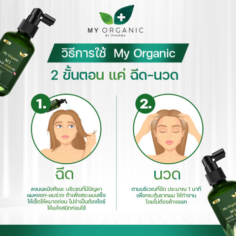 ฉีด – ฉีด My Organic M1 Hair Serum ลงบนหนังศีรษะบริเวณที่ต้องการดูแลเป็นพิเศษ เช่น บริเวณที่มีผมหงอก หรือผมบาง (ใช้หลังสระผม เช็ดผมให้หมาดได้ทันที ไม่ต้องรอให้แห้งสนิท)