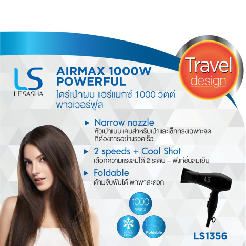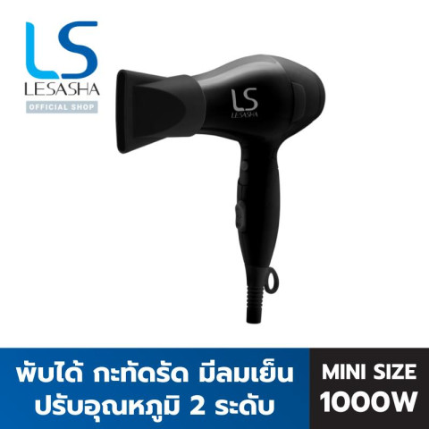 LESASHA ไดร์เป่าผม Airmax Powerful Hair Dryer 1000W รุ่น LS1356 (BLACK) ไดร์ขนาดพกพาที่ตอบโจทย์ทั้งใช้ที่บ้านและพกติดกระเป๋าไปต่างจังหวัด/นอกบ้าน ด้วยดีไซน์เล็กกระทัดรัด พับเก็บได้ ประหยัดพื้นที่ พกพาง่าย เหมาะมากสำหรับเด็ก วัยรุ่น หรือคนที่อยากได้ไดร์เครื่องเล็กแต่เป่าได้จริง ลมแรง ร้อนกำลังดี ช่วยให้ผมแห้งไวแบบไม่ทำร้ายเส้นผมและยัง ประหยัดไฟ ใช้ได้คุ้มค่าในทุกวัน