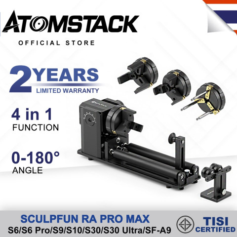 ATOMSTACK SCULPFUN Ra ProMax (RA Pro) อุปกรณ์แกะสลักแบบหมุนมัลติฟังก์ชั่น ยกระดับงานเลเซอร์ให้ “แกะสลักวัตถุทรงกระบอก/ทรงกลม/ชิ้นงานรูปทรงพิเศษ” ได้คมชัดและแม่นยำ ไม่ว่าจะเป็นแก้วไวน์ แก้วมีหูจับ ลูกเบสบอล หรือชิ้นงานดีไซน์เฉพาะตัว เพียงต่อเข้ากับเครื่องเลเซอร์ที่รองรับก็พร้อมใช้งานทันทีแบบ Plug & Play