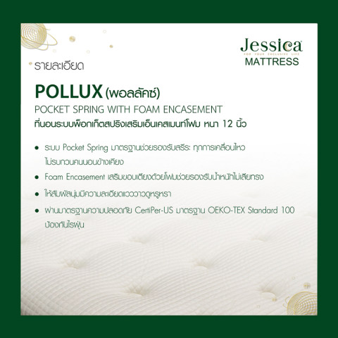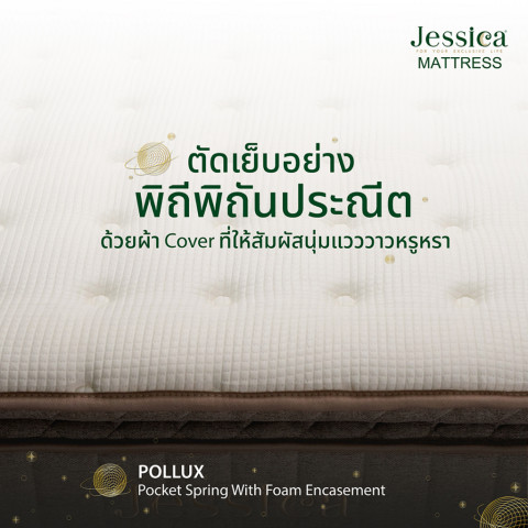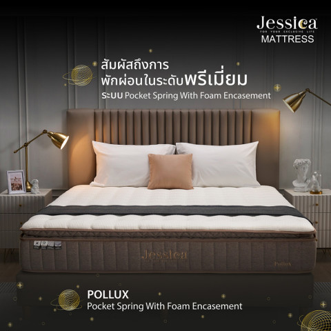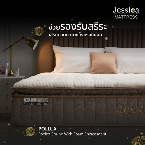 ที่นอน Jessica รุ่น Pollux (พอลลักซ์) หนา 12 นิ้ว นอนสบายแบบลัคชู รองรับสรีระได้ดี ด้วยระบบ Pocket Spring แยกอิสระ ลดแรงสั่นสะเทือน—คนข้างๆ พลิกตัวก็ไม่ค่อยรบกวนการนอนของคุณ พร้อมเสริมโฟมหลายชั้นและ Foam Encasement รอบขอบที่นอน ช่วยพยุงขอบแน่นขึ้น นั่ง/นอนชิดขอบได้มั่นใจ ไม่ย้วยง่าย ใช้งานได้ยาวนาน พร้อม รับประกัน 15 ปี