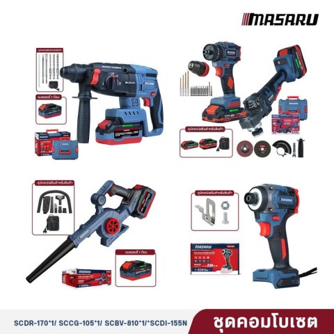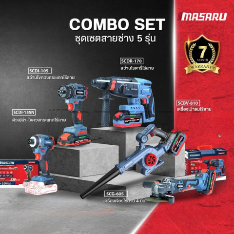 MASARU COMBO SET 5 ชิ้น ชุดเครื่องมือช่างครบเซ็ตสำหรับงานติดตั้ง ซ่อมบำรุง และงานช่างมือโปร รวมเครื่องมือไร้สายที่ใช้งานบ่อยที่สุดไว้ในชุดเดียว ช่วยให้คุณทำงานได้คล่องตัว พกพาสะดวก และพร้อมลุยได้หลากหลายหน้างานในราคาคุ้มค่า เพียง 8,199.18 บาท