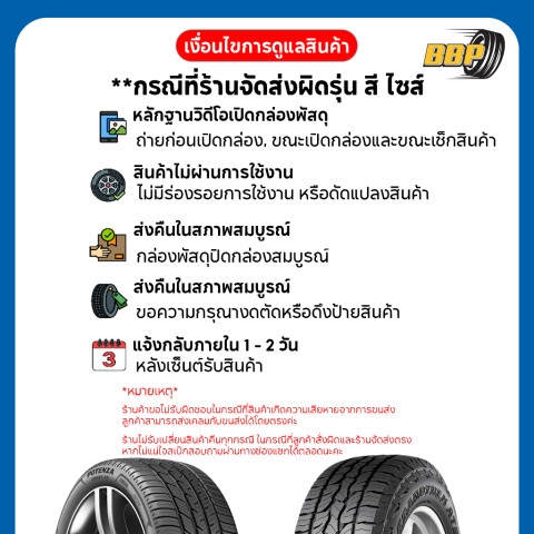 กรณีเคลมผ่าน: อาจได้รับยางเส้นใหม่ หรือเงินชดเชยตามเปอร์เซ็นต์ดอกยางที่เหลือ ตามเงื่อนไขของผู้ผลิต