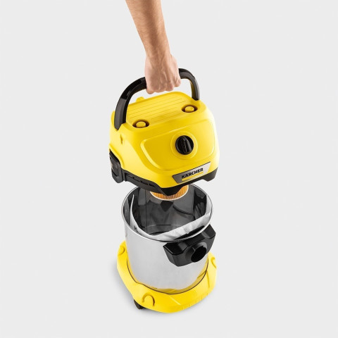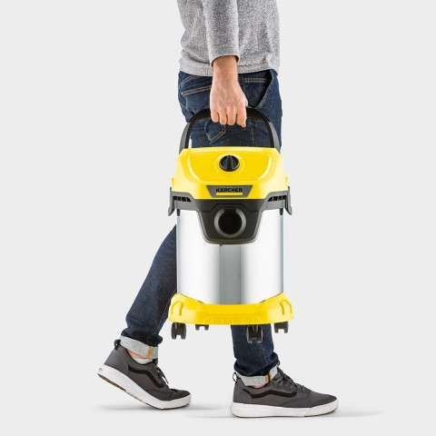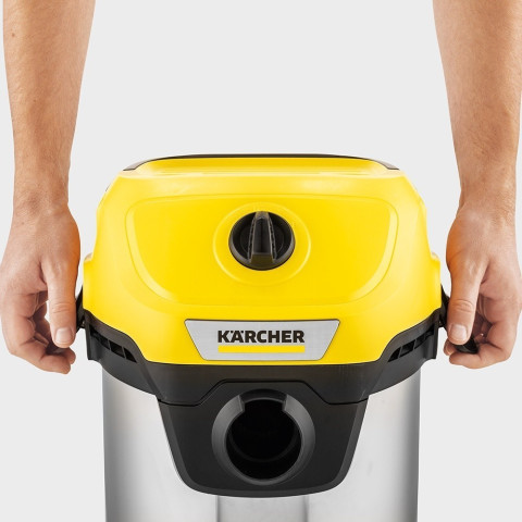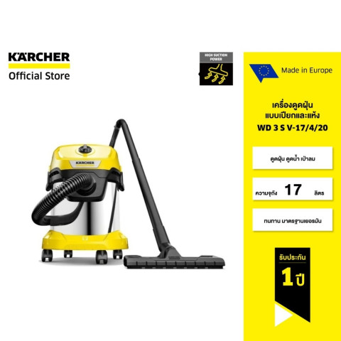 KARCHER เครื่องดูดฝุ่นแบบเปียกและแห้ง WD 3 S V-17/4/20 ครบจบในเครื่องเดียวทั้ง ดูดฝุ่นแห้ง, ดูดน้ำ และ เป่าลม ด้วยกำลังไฟเพียง 1000 วัตต์ ให้แรงดูดทรงพลัง ประหยัดพลังงาน พร้อมถัง สแตนเลสความจุ 17 ลิตร ทนทาน ใช้งานได้ทั้งงานบ้าน งานร้านค้า หรือพื้นที่ที่ต้องเจอสภาพเปียก-แห้งบ่อยๆ จัดเก็บง่ายด้วยดีไซน์ที่คิดมาเพื่อความเป็นระเบียบ ใช้งานสะดวกระหว่างพักด้วยที่วางท่อดูดและหัวดูดพื้น รวมถึงระบบล็อก Pull & Push ที่ถอด-ใส่ถังได้รวดเร็ว