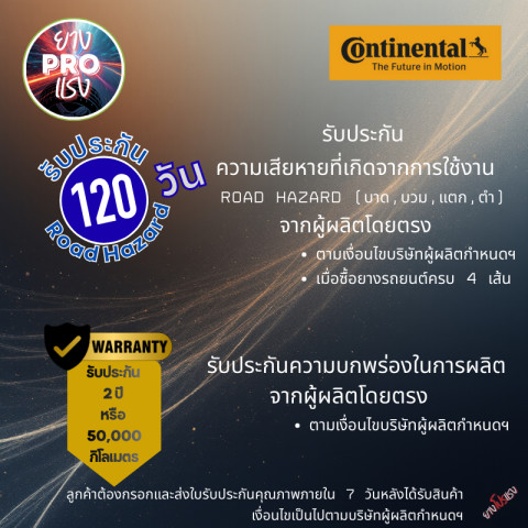 รับประกันความเสียหายจากการใช้งานจริง (Road Hazard เช่น บาด, บวม, แตก, ตำ) ตามเงื่อนไขบริษัทผู้ผลิต