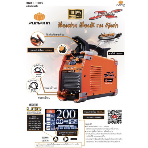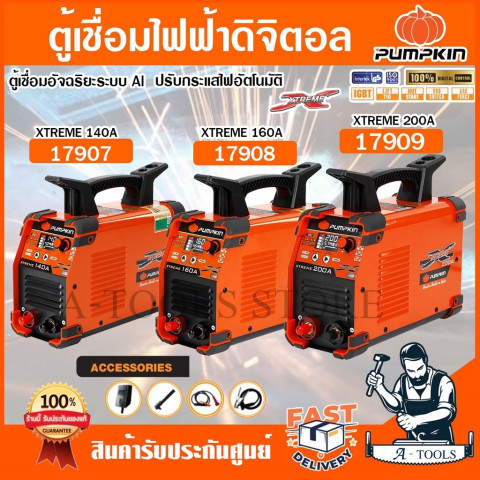 PUMPKIN (พัมคิน) XTREME ตู้เชื่อมระบบ DIGITAL หน้าจอ LCD เลือกรุ่นได้ 3 ขนาดกระแส (140A/160A/200A) ให้การเชื่อมลื่นไหล กระแสไฟคงที่ด้วยเทคโนโลยี IGBT ตอบโจทย์ทั้งงานช่างทั่วไป งานโครงสร้าง และงานเชื่อมที่ต้องการความต่อเนื่อง พร้อมระบบช่วยเชื่อมครบ เช่น HOT START, ARC FORCE, ANTI STICK และ VRD เพื่อความปลอดภัยและคุณภาพแนวเชื่อมที่สวยงาม