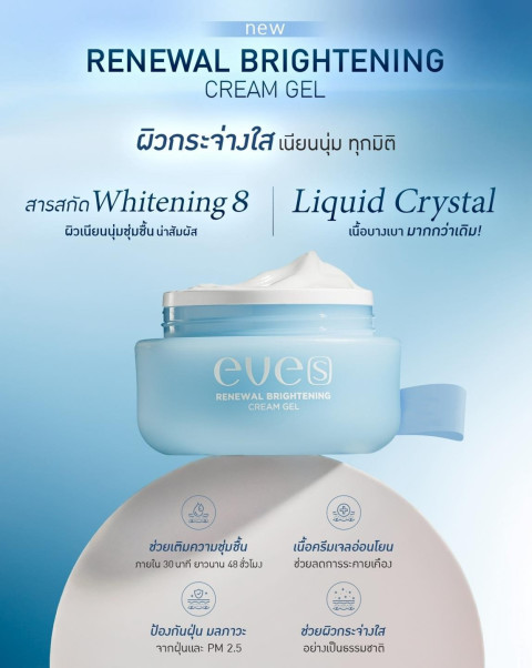 [ 3 กระปุก ] EVES RENEWAL BRIGHTENING ครีมเจลฟ้า ครีมบำรุงผิวหน้าสูตรครีมเจลเนื้อบางเบา ซึมไว ช่วยดูแลปัญหารอยสิว ฝ้า กระ และจุดด่างดำ พร้อมเติมความชุ่มชื้นให้ผิวดูอิ่มน้ำ ผิวดูเรียบเนียนกระจ่างใสอย่างเป็นธรรมชาติ เหมาะสำหรับผู้ที่ต้องการฟื้นบำรุงผิวให้ดูสุขภาพดีในทุกวัน และคนท้องสามารถใช้ได้