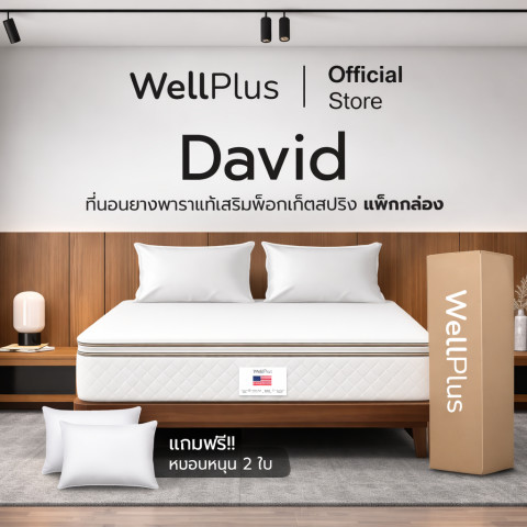 สัมผัสประสบการณ์การนอนระดับพรีเมียมกับ WellPlus รุ่น David ที่นอนยางพาราแท้เสริมพ็อกเก็ตสปริง หนา 10 นิ้ว ที่ออกแบบมาเพื่อรองรับสรีระอย่างลงตัว ให้ความรู้สึกนุ่ม แน่น เด้ง รองรับหลังและกระดูกสันหลังได้อย่างเหมาะสม ตื่นมาพร้อมความสดชื่นทุกเช้า