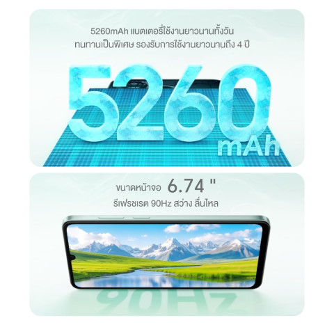 จุดเด่นคือแบตเตอรี่ความจุสูง 5260mAh ใช้งานได้ยาวนานตลอดวัน ลดความกังวลเรื่องแบตหมดระหว่างวัน เหมาะสำหรับคนที่ต้องใช้งานมือถือบ่อย ไม่ว่าจะเรียน ทำงาน หรือความบันเทิง