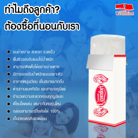 UCOMFORT รุ่น Family เหมาะสำหรับผู้ที่มีงบประมาณจำกัด แต่ไม่อยากลดทอนคุณภาพการนอน เป็นตัวเลือกที่ลงตัวสำหรับทุกคนในครอบครัว ทั้งความนุ่มสบาย รองรับสรีระ และความคุ้มค่าที่ใช้ได้นานหลายปี