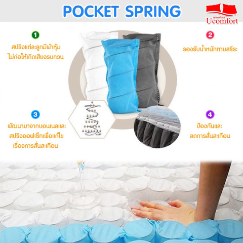 Pocket Spring 5 Zone สปริงแยกอิสระแบ่งเป็น 5 โซนรับน้ำหนัก ช่วยรองรับศีรษะ ไหล่ หลัง สะโพก และขา ตามหลักสรีรศาสตร์ ลดแรงสั่นสะเทือนขณะพลิกตัว เหมาะสำหรับผู้นอนกระสับกระส่ายหรือคู่รักที่ตื่นง่าย