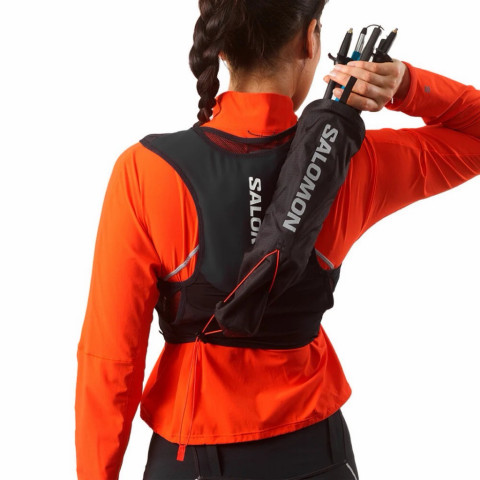 เข้าถึงน้ำได้รวดเร็ว – ช่องด้านหน้าพร้อมขวดน้ำแบบนิ่ม Salomon ขนาด 500 มล. 2 ใบ (แถมให้ในชุด) หยิบดื่มง่าย ลดการกระเด้ง พร้อมห่วงยางยืดล็อกให้แน่น
