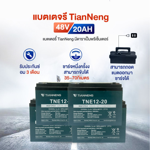 แบตเตอรี่ 48V 20AH (CHILWEE/TianNeng) ถอดออกมาชาร์จได้ วิ่งได้ประมาณ 35–70 กม./การชาร์จ 1 ครั้ง (ขึ้นกับน้ำหนักบรรทุกและสภาพเส้นทาง)