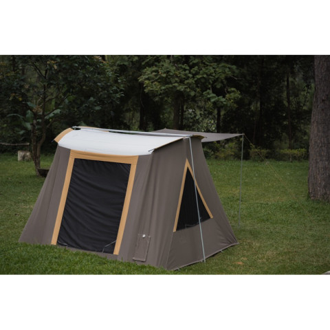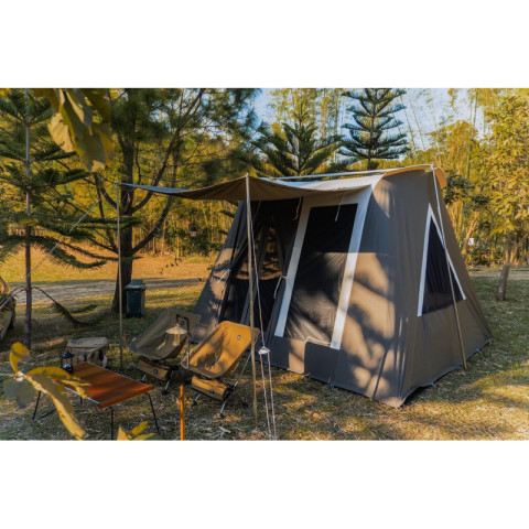 ตัวเต็นท์ใช้ผ้าฝ้ายแคนวาสแท้ทั้งผืน (ไม่ใช่ผ้าผสม) ให้สัมผัสที่เป็นธรรมชาติ โปร่งสบาย ระบายอากาศดีเยี่ยม หลังคาเป็นผ้า Pure Cotton ให้ฟีลลิ่งสบายตาและช่วยให้ภายในไม่ร้อนอบอ้าว พื้นเต็นท์เป็น PVC Rip Stop หนา 19 Oz. กันน้ำ ทนทานต่อการเสียดสี ใช้งานได้ยาวนาน เหมาะสำหรับทั้งแคมป์ครอบครัวและแคมป์จริงจัง