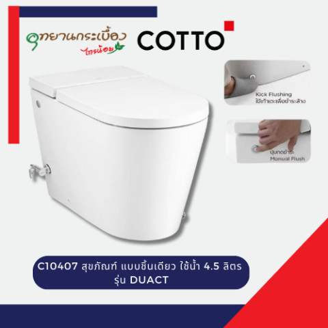 COTTO C10407 สุขภัณฑ์ชิ้นเดียว 4.5L รุ่น DUACT คือสุขภัณฑ์ดีไซน์ทันสมัยแบบไร้หม้อน้ำ ตอบโจทย์ห้องน้ำยุคใหม่โดยเฉพาะพื้นที่จำกัด ด้วยระบบชำระล้าง Rimless Direct Flushing ฟลัชน้ำตรง ช่วยให้ทำความสะอาดได้หมดจด ใช้น้ำเพียง 4.5 ลิตร ต่อครั้ง ประหยัดน้ำและคงความสะอาดได้อย่างมั่นใจ