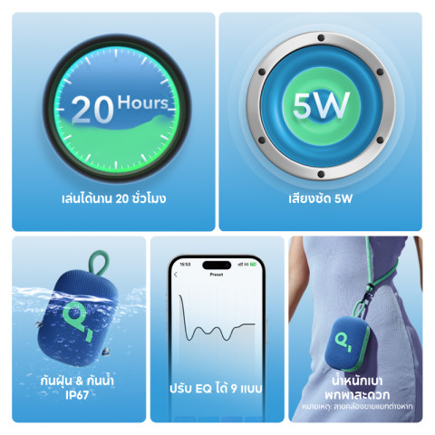 จุดเด่น: ซับวูฟเฟอร์ในตัว, ปรับ EQ, IP67 กันน้ำกันฝุ่น