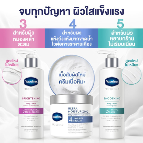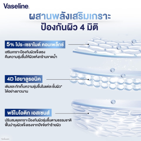 วาสลีน โปร เดอร์มา 4 มอยซ์ ครีมเนื้อหิมะ 360ก (Vaseline Proderma Body Lotion 360G) โลชั่นบำรุงผิวกายเนื้อหิมะ สัมผัสบางเบาแต่ให้ความชุ่มชื้นล้ำลึก เหมาะสำหรับคนผิวแห้ง ผิวขาดน้ำ หรือผิวที่ต้องการการบำรุงเป็นพิเศษในทุกวัน ช่วยให้ผิวดูนุ่ม เด้ง และเรียบเนียนขึ้น พร้อมเติมความชุ่มชื้นยาวนานเพื่อผิวดูสุขภาพดี