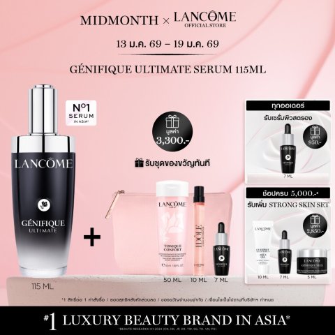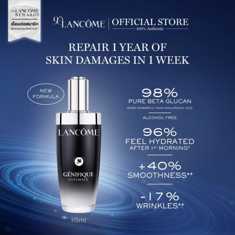 LANCOME GENIFIQUE ULTIMATE DUAL-REPAIR AUGMENTED SERUM 115 ML (สูตรใหม่!) เซรั่มอันดับ 1 จากลังโคมเพื่อการฟื้นบำรุงผิวแบบเร่งด่วน ช่วยเติมความชุ่มชื้นให้ผิวดูอิ่มฟูมากขึ้น พร้อมฟื้นผิวเสียสะสมให้ผิวดูแข็งแรงและเรียบเนียนขึ้นภายใน 1 สัปดาห์* ด้วยเทคโนโลยีจดสิทธิบัตรและ เบต้ากลูแคนบริสุทธิ์ 98% (Betaglucan) เพื่อการดูแลผิวแบบ Dual-Repair ให้ผิวดูสุขภาพดี เปล่งปลั่ง และพร้อมรับการบำรุงในขั้นต่อไป