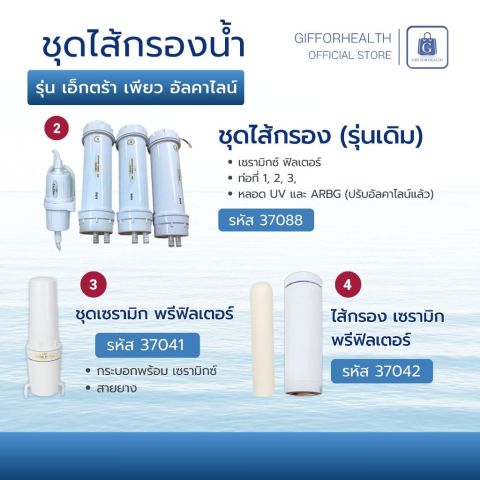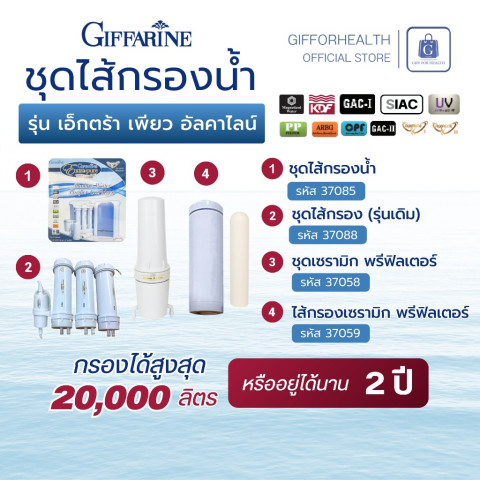ไส้กรองน้ำดื่ม กิฟฟารีน Extra Pure Alkaline แท้ เพิ่มแร่ธาตุ น้ำด่างเพื่อสุขภาพ (Giffarine) ในราคา 5,624.00 บาท ช่วยให้คุณมั่นใจได้ว่าน้ำดื่มในบ้าน “สะอาด ปลอดภัย และมีคุณค่า” เหมาะสำหรับครอบครัวที่ใส่ใจสุขภาพ ต้องการน้ำด่าง pH 8.0–9.0 และต้องการระบบฆ่าเชื้อที่เชื่อถือได้สำหรับการดื่มทุกวัน