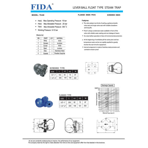 FIDA Ball Float Steam Trap รุ่น TS-60 อุปกรณ์ดักคอนเดนเสทแบบลูกลอย (Ball Float) สำหรับระบบไอน้ำ ช่วยระบายคอนเดนเสทได้อย่างต่อเนื่อง ลดการสูญเสียไอน้ำ เพิ่มประสิทธิภาพการถ่ายเทความร้อน และช่วยให้ระบบทำงานเสถียร เหมาะกับงานอุตสาหกรรมและไลน์ผลิตที่ต้องการความแม่นยำในการควบคุมคอนเดนเสท