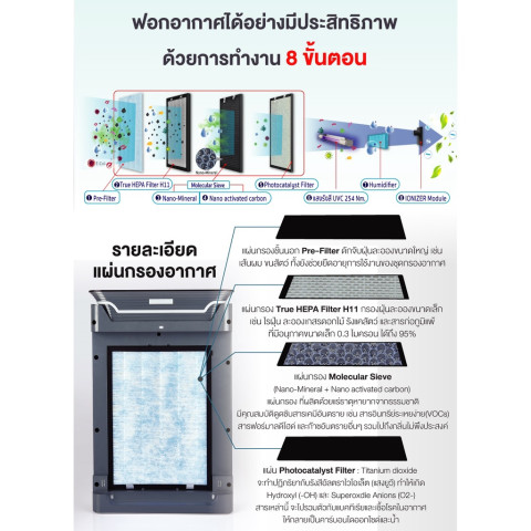ฟอกอากาศทรงพลัง ครบ 8 ขั้นตอน จัดการฝุ่น กลิ่น ควัน และสารก่อภูมิแพ้ได้อย่างมีประสิทธิภาพ