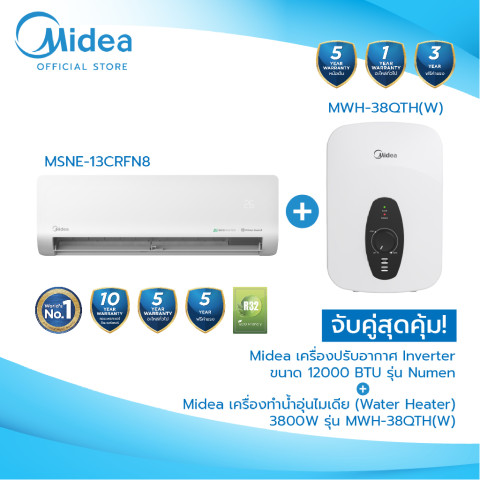 จับคู่สุดคุ้ม!! Midea แอร์ติดผนัง Inverter 12,000 BTU รุ่น Numen + เครื่องทำน้ำอุ่นพร้อมชุดฝักบัว MWH-38QTH ในราคา 11,498.40 บาท เซ็ตเดียวจบเพื่อความสบายทั้ง “เย็นเร็ว ประหยัดไฟ” และ “อาบอุ่นปลอดภัย” เหมาะกับคอนโด/ห้องนอน/ห้องทำงานขนาดมาตรฐาน พร้อมการรับประกันอุ่นใจจาก Midea
