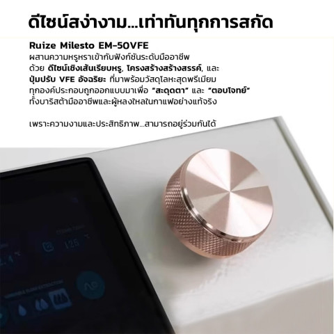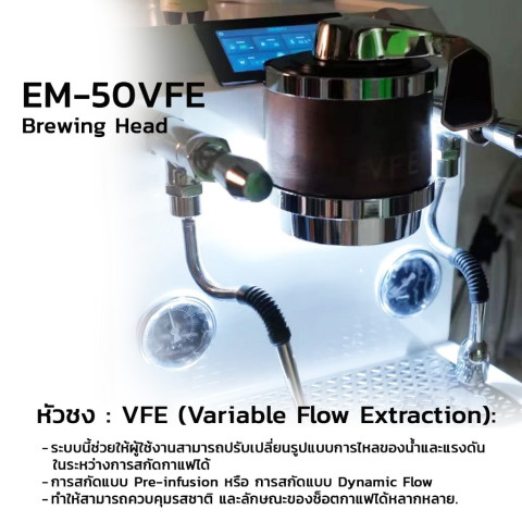 VFE (Variable Flow Extraction) คือระบบที่ช่วยให้ผู้ใช้ ควบคุมรูปแบบการไหลของน้ำและแรงดัน ระหว่างการสกัดได้ ทำให้คุณทดลองโพรไฟล์ได้หลากหลาย เช่น เพิ่มความหวาน ลดความฝาด ดึงกลิ่นหอมให้ชัด หรือทำให้บอดี้แน่นขึ้น โดยแสดงผลและควบคุมผ่าน หน้าจอ LCD เพื่อความแม่นยำในทุกช็อต