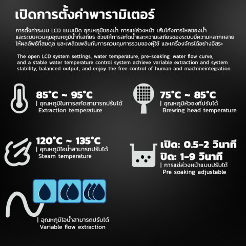 ปรับแรงดันการสกัดได้ 3 ระดับ (3 / 6 / 9 bar) และควบคุมการไหลของน้ำผ่าน หน้าจอ LCD ช่วยให้คุณสร้างคาแรกเตอร์ช็อตได้ตามต้องการ ไม่ว่าจะเป็นเมล็ดคั่วอ่อน คั่วกลาง หรือคั่วเข้มโปรแกรมได้จริง จบงานไว