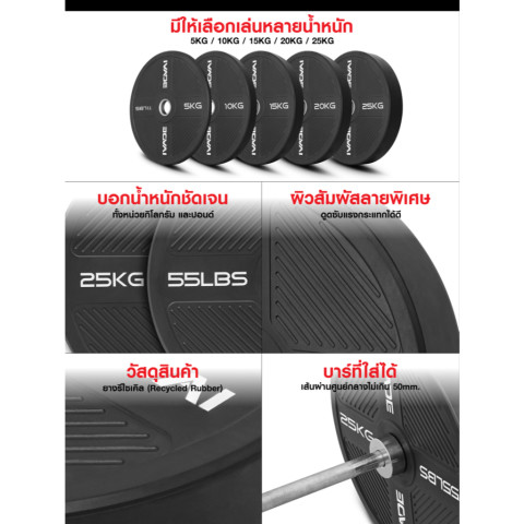 ประเภท : Bumper Plate รูมาตรฐาน 2 นิ้ว (Olympic)