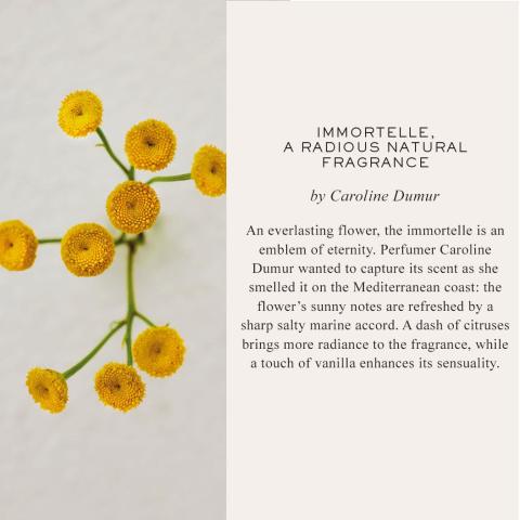แรงบันดาลใจของกลิ่น Immortelle: “ดอกไม้永กาล” ที่เป็นสัญลักษณ์ของความเป็นนิรันดร์ โดย Perfumer Caroline Dumur ถ่ายทอดกลิ่นที่เธอสัมผัสได้จากชายฝั่งเมดิเตอร์เรเนียน