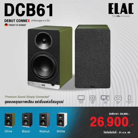 ELAC DCB61 Bluetooth Speaker (Debut ConneX DCB61) สีขาว ลำโพงแอ็กทิฟ 2.0 รุ่นล่าสุดจาก ELAC แบรนด์เครื่องเสียงสัญชาติเยอรมนี ที่อัปเกรดตู้ให้ใหญ่ขึ้น พร้อมวูฟเฟอร์ 6 1/2 นิ้ว และภาคขยายกำลังขับ 160W RMS (สูงสุด 320W Peak) ให้เสียงเต็มอิ่ม เบสลึกแน่น รายละเอียดชัดเจน เหมาะทั้งดูหนัง ฟังเพลง และใช้งานเป็นชุดลำโพงหลักของบ้านแบบ “ต่อแล้วจบ” ด้วยการเชื่อมต่อที่ครบครัน รวมถึง HDMI ARC และ Bluetooth ใช้งานง่ายได้ทุกวัน