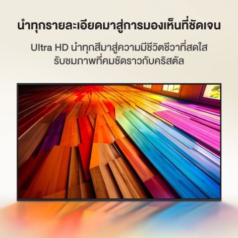LG ทีวี 65" UHD 60Hz Smart TV รุ่น 65UT8050 (UT8050PSB) ปี 2024 จอใหญ่เต็มตา คมชัดระดับ 4K พร้อมระบบสมาร์ททีวี webOS 24 ใช้งานลื่น ดูหนัง ซีรีส์ และคอนเทนต์สตรีมมิงได้สะดวก ควบคุมง่ายด้วย Magic Remote ที่ให้มาในกล่อง เติมอรรถรสด้วยเสียง AI Sound Pro จำลองรอบทิศทาง 9.1.2 และรองรับ Dolby Digital เหมาะทั้งดูทีวีทั่วไป ดูภาพยนตร์ และเล่นเกมบนคอนโซลด้วยโหมดลดดีเลย์อัตโนมัติ